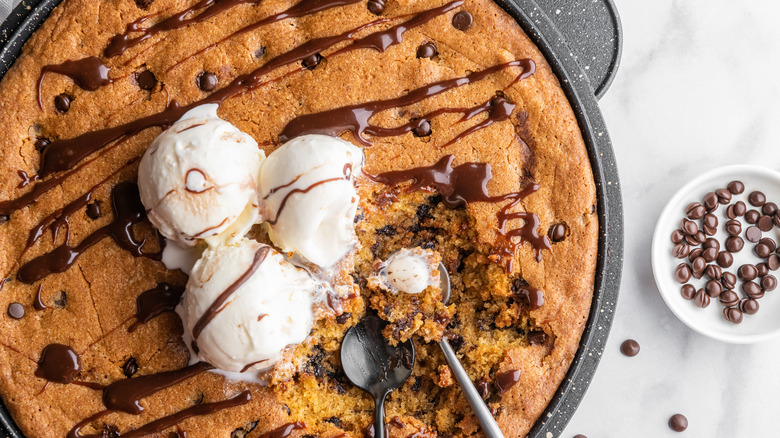 Nobody appreciates a homecooked meal as much as a Cancer does, and while one could argue that all desserts are comforting, the one that Cancers would have needs to be especially so. That's why, if this sign were any classic dessert, they'd be a skillet cookie. Chocolate chip cookies are already known to be a universal favorite, but when they're baked in a large skillet and topped with a cold scoop of ice cream, magic happens. You could also go the classic PB&J skillet cookie route, but that classic combination of cold and warm only amplifies the chocolate chip cookie's salty yet sweet flavor and crunchy yet soft texture to hit your taste buds from all angles. Either way, it's nostalgia on a plate, and, fortunately for the Cancer, it's surprisingly simple to master at home.