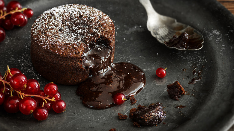 There's nothing quite as indulgent as a molten chocolate cake, also known as chocolate lava cake. It takes the saying "death by chocolate" to a whole other level. The rich, gooey chocolate cake has a center that is filled with flowing, warm chocolate. With each bite, the warm chocolate filling spreads across your plate to, hopefully, meet the scoop of vanilla ice cream or sweet whipped cream it's classically served with. Found on essentially every restaurant menu in America, the molten chocolate cake is as dependable as it is extravagant. So, if you've had a particularly rough day — the kind that only chocolate cake can turn around — and your Taurus friend is busy, you know what to order.