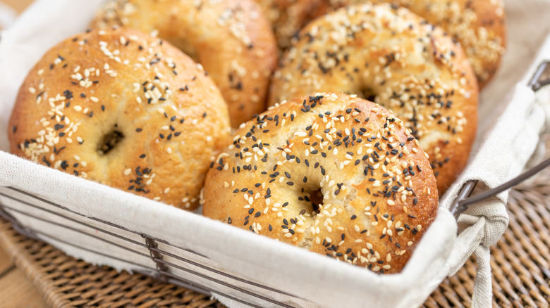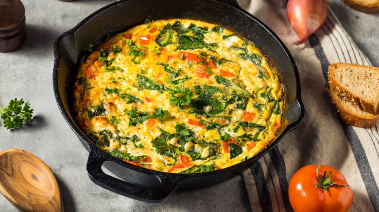 Have you ever noticed how most sleeves of bagels sold in grocery stores come in packs of six? There are five days in the average work week and seven days in the actual week. Six bagels are simultaneously too many and not enough bagels for a consumer's needs — and nailing the perfect cream-cheese-to-bagel ratio is a whole other matter entirely. Good luck timing it exactly right so that you run out of bagels and cream cheese on the same day. Almost invariably, there'll be a leftover bagel or two in the pack that goes stale before you have the chance to eat it. But never fear. This frittata tip has your back: Put those stale bagels to good use and turn them into a knockout frittata.
