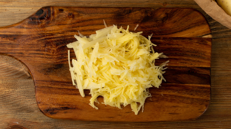 Instead of slicing the potatoes into chunks and boiling them, this recipe uses potatoes more like vegetables and less like starches. The objective is to remove all starch and maintain a crunchy texture as if this were a raw shredded carrot or zucchini salad. Once you rid the potatoes of their skin, you shred them into thin slivers and cook them in boiling water for just a couple of minutes before blanching them in cold water and drying them with a cloth.