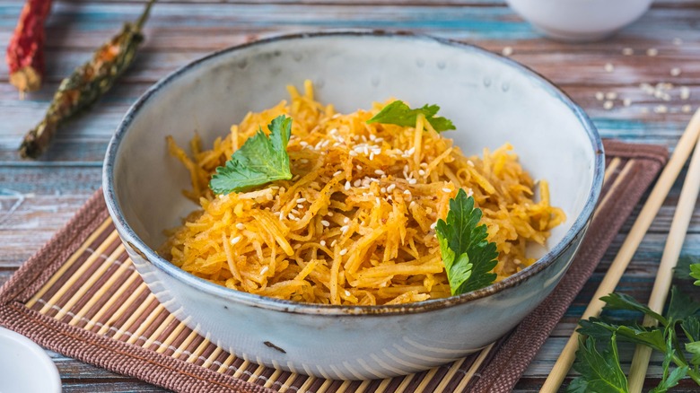 You can throw in raw slivered veggies like carrots or thin enoki mushrooms for uniform shapes with varied textures. You can add the sauce's ingredients directly to the veggies, pouring scallion oil, sesame oil, chili oil or whole Sichuan peppercorns, soy sauce, rice vinegar, sugar, and minced garlic, then stirring to coat. Some recipes heat the sauce in a skillet for more fragrance before pouring it over the shredded potato. Others forgo boiling the potatoes and instead opt to stir-fry the potatoes in the sauce for a few minutes. The desired result is a crunchy, spicy, savory, and slightly sweet salad that is highly flavorful and not heavy.