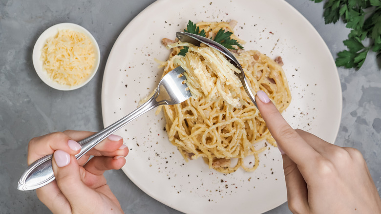 Why is it such a big no-no? As many Italians believe, the whole point of eating long noodles is to enjoy them as-is. If you want bite-sized pasta, order a shorter type like ziti or orecchiette. There is one caveat to this unofficial rule, however: Italians may not mind if you cut your noodles to make them easier for small children to eat. As Pasta Evangelists' Head Chef Roberta D'Elia explained, "The only people who are allowed to cut spaghetti are two-year olds! I remember my mamma doing spaghetti-twirling 'training' with us when [we were] about three years old. After that, we saw cutting spaghetti as something 'babies' did." It's not just spaghetti that Italians believe shouldn't be cut; this mantra applies to other types of long noodles too, such as fettuccine.