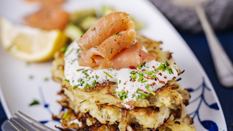 The more I did it, the more I was like, "This is the only way I want to eat a latke — piled on with not just regular sour cream, but sour cream that's zhuzhed up with horseradish." I also do beet horseradish, or sometimes, if I do it in a Middle Eastern way, I'll do it with a cucumber yogurt sauce. Then you're like, "What goes on top?" It's like, "Well, we could do lox, we could do caviar. We could do the Middle Eastern one — cucumber yogurt sauce and salmon roe is magical."