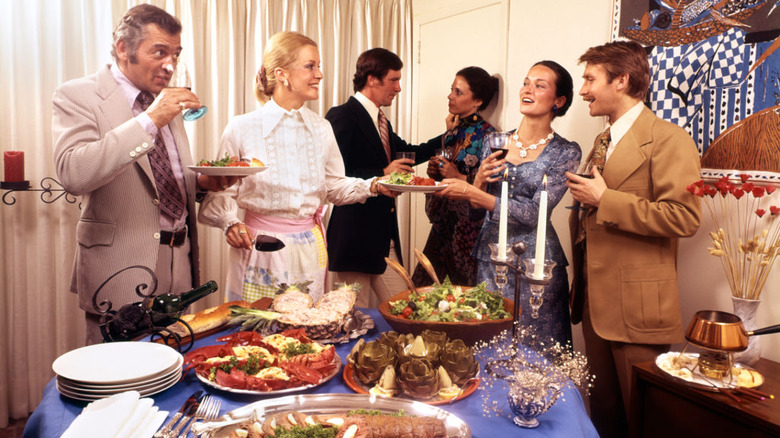 To home cooks of the 1970s, entertaining was a big deal. Dinner parties were frequent and elaborate, characterized by attention to detail, a flair for the upscale, and often labor-intensive prep. Popular dishes of the '80s included Chicken Kiev, salmon rillettes, and seven-layer dips. It was an era of culinary growth for American foodies — but it certainly wasn't without a few growing pains. Kitschy dishes with equally kitschy names emerged, like "beef tingler" and "eggs in a cage." Various gelatins were pretty big, as were ham and banana hollandaise. When vintage foodies were whipping up vol-au-vent, common fillings included smoked trout, horseradish, and asparagus. Spiced egg with coriander mayo was a popular one, too. Today, the hors d'oeuvre remains worthy of a spot in your dinner party spread (just maybe with a different flavor).