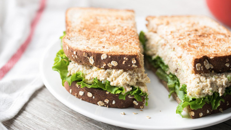 Lightly brown your bread in the toaster or in a pan and add lettuce to the slice that will become the bottom of the sandwich. Spoon the chicken salad on top and enjoy.
