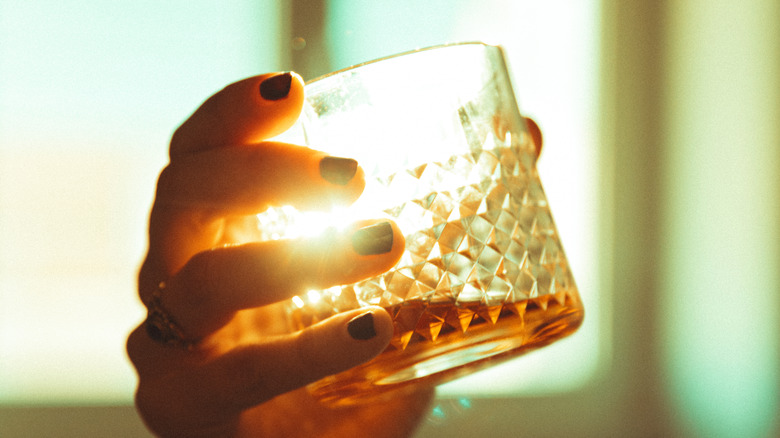 The next time you're in the mood for bourbon, try drinking it on the rocks with a small splash of water. A little goes a long way, and remember that you can always add more water, but you can't take it out — so err on the side of caution. You should also keep in mind that your ice will also add water, so don't be too heavy-handed. If you like a little effervescence, consider adding a splash of soda water instead. It's the perfect way to make bourbon more refreshing without covering up the flavor.