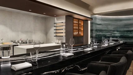 Located one flight of stairs down from the 32nd Street and Broadway NE corner access to the subway, the entrance to Nōksu has a speakeasy-esque, almost clandestine, vibe marked only by a discreet plaque and a silver keypad on an otherwise unremarkable black door. Entry is via a key code Nōksu sends patrons on the day of their reservation. The intrigue continues as the door swings open, revealing a hidden space worlds away from the commotion of a busy NYC subway platform. Designed by Claire Soojin Kim, the 12-seat bar is a reflection of "noksu," a term Kwak told Tasting Table means, "A clear stream of water flowing from the valley." It's sleek and calm and toney all at the same time.