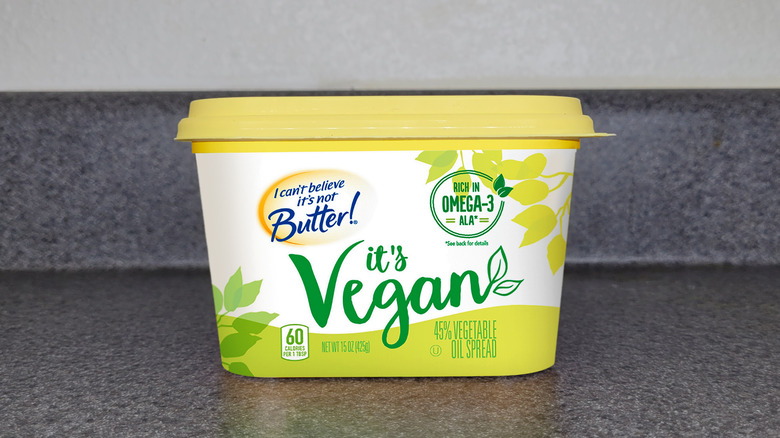 While the original I Can't Believe It's Not Butter contains milk, the brand has grown to include a vegan offering. Marketed as a "healthier" alternative to dairy butter, both the original and the new offerings have 70% less saturated fat and 40% fewer calories. When it comes to taste, it's very salt-heavy — the flavor hits the palate with a bang and then vanishes before you can blink. The consistency is somewhat watery and lacks body and there's an unappealing oiliness as well.