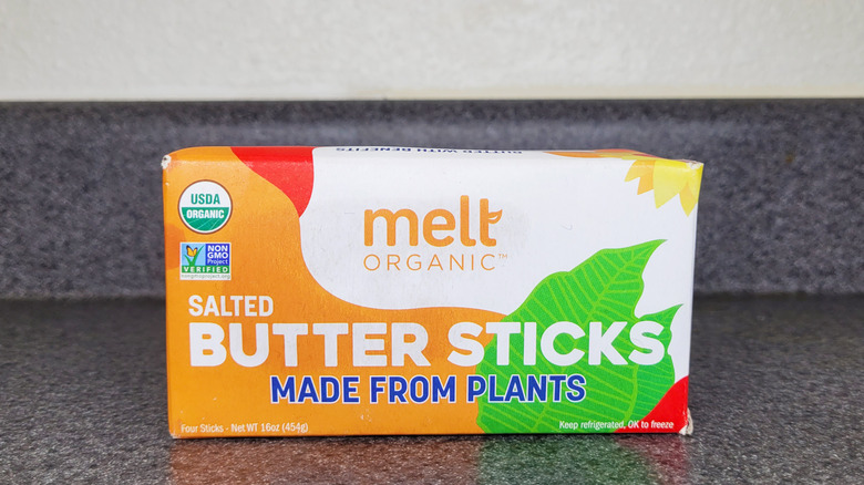 Another affordably priced yet less than spectacular vegan option comes from Melt Organic. It's honestly confounding how some plant-based alternatives make it into grocery stores. While it's completely understandable to not perfect the distinct taste of butter, to make something that's clearly a world apart in flavor and consistency is just plain rude. Closer to margarine, Melt Organic butter has a waxy, plastic-like taste with an oily finish. It immediately invokes an expression of "ew." If you're looking to substitute real butter with a vegan alternative, Melt Organic is not likely to convert you.