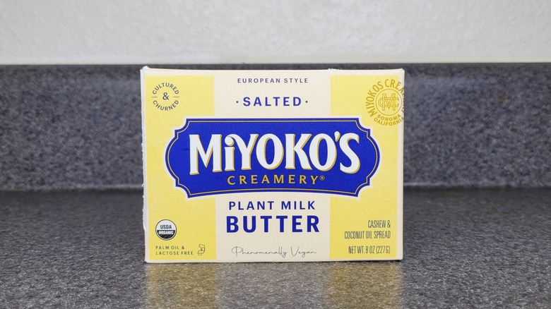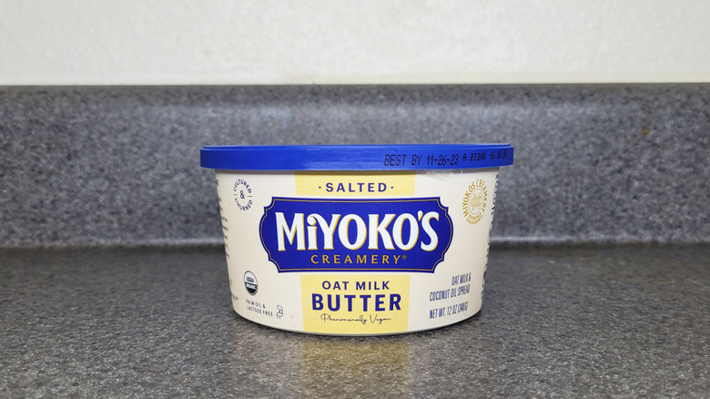 This next vegan butter comes from Miyoko's Creamery and is made with oat milk. Miyoko's is a brand that makes a range of dairy-free alternatives using simple, quality ingredients. Whereas many vegan brands offer shredded and sliced cheese, Miyoko's goes further by offering spreadable cheese options like brie and smoked gouda. In other words, they have the taste and consistency of dairy-based foods down to a science. That's why it's so surprising to find that the oat milk butter doesn't deliver the same level of quality. To be clear, it's not bad, it's just not Miyoko's-level good.