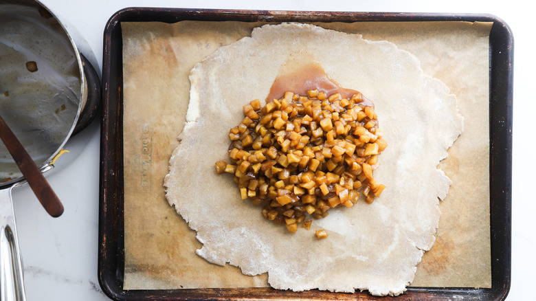 - Spread the caramelized apple mixture onto the center of the dough, leaving a 2-inch border all around.