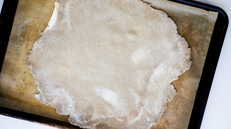 - On a floured surface, roll out your dough into a circle approximately 12 inches in diameter. Transfer the dough onto a baking sheet lined with parchment paper or a silicone baking mat.
