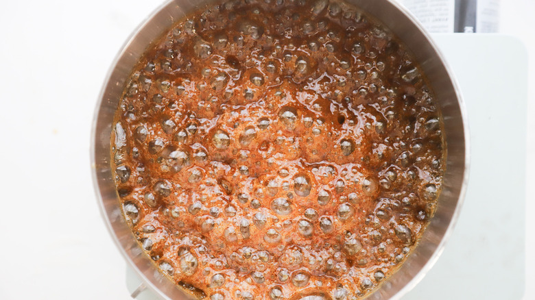 After preheating your oven, the first step is to create the maple syrup mixture that will flavor the apple filling. While some apple pie recipes have you simply toss the apples with sugar and go, this method reduces the time it takes for the pastry to bake and concentrates the maple flavor. Be careful not to overcook this sugar mixture, as it can burn quickly. When the sugars come to a simmer, fold in the butter, cinnamon, and salt.