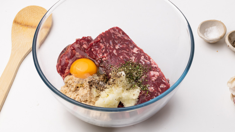 - In a large bowl, add the venison mince along with the panade, the onions and garlic, the egg, the rosemary, and the salt and pepper.
