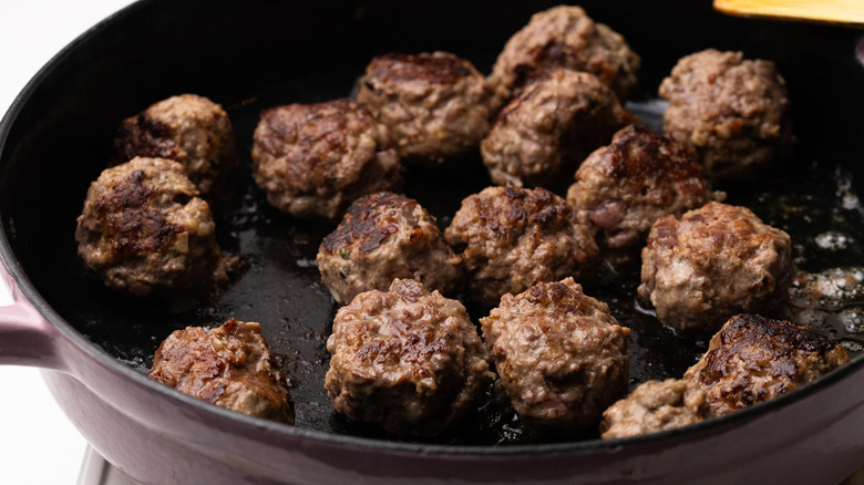 With the meatballs formed, you can now turn your attention to cooking them. You'll want to fry them in cooking oil over medium-high heat; this process gives the meat heaps of added depth and also flavors the pan ahead of making the sauce. Thanks to a process called the Maillard reaction, the outsides of the meatballs get deliciously caramelized, not only making them taste irresistible but also giving them a beautiful, slightly crispy texture.