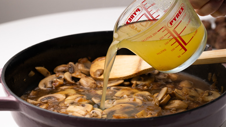 - Add the brandy to the pan and cook for 3 to 4 minutes, before adding the chicken stock and then the cream.