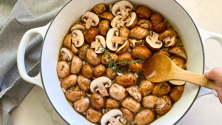 To make this recipe, the key ingredients are cremini mushrooms and prepared chestnuts. "Prepared chestnuts have been boiled first, so the shell can be removed, then roasted," Hahn explains. You'll also need onion, garlic, and fresh thyme from the produce department.