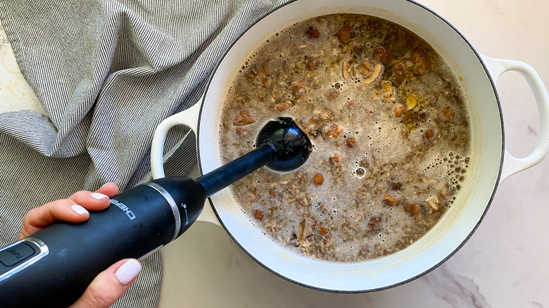 To add some thickness to the soup, you'll blend half of it. You can do this with an immersion blender, or simply remove half of the soup and put it into a countertop blender. Once blended, add it back to the pot. "At this point, if you want to add more broth to the soup to make it thinner, do that now," Hahn explains.