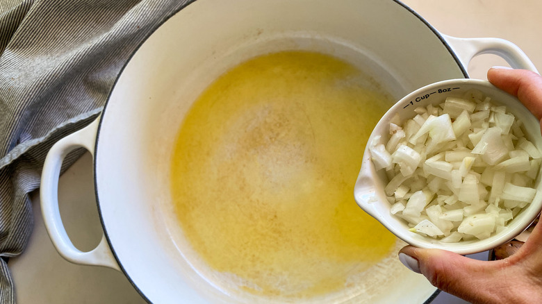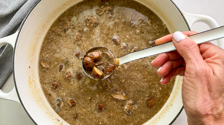 Our first step is to soften up the vegetables and chestnuts. Pull out a large soup pot or Dutch oven and add the butter over medium heat. Once the butter is melted, add the onions and sauté for 3 minutes, then add the garlic, mushrooms, and chestnuts. Cook for 5 minutes, stirring frequently. "Using butter here instead of oil will yield a creamy, silk-like texture for the soup," Hahn shares.