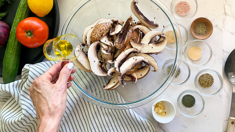 Put the sliced mushrooms into a large bowl and toss with 2 tablespoons of oil, the chopped garlic cloves, the juice of ½ a lemon, ½ teaspoon salt, garlic powder, onion powder, dried dill, marjoram, and ⅛ teaspoon of pepper. "This will coat the mushrooms in all of the spices, so they are ready to soften up in the pan," Hahn explains.