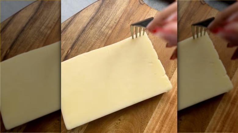 This fork technique, popularized on TikTok by user ConVino Board, calls for pre-planning your cuts with a fork. To pull off the hack, simply mark your cheese with your fork by poking the tines directly into your block of cheese. This creates slight idents that you can use to guide your knife. Basically, you'll use those little dots to measure where you should slice. You'll be left with evenly spaced slices that all have the same consistency. Too thick or too thin slices will be a thing of the past.