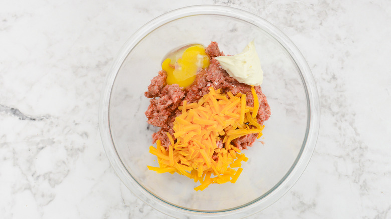 Step 1: Add sausage, cheddar cheese, cream cheese, and the egg to a bowl
