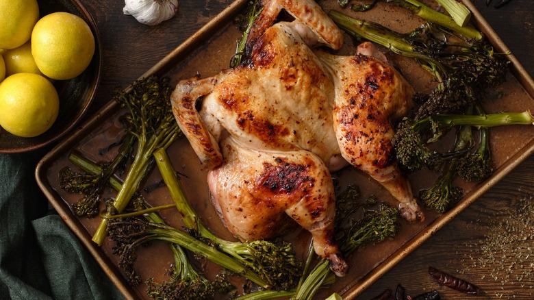 [Without too much effort], you come out with a full meal that has roasted chicken that's citrusy and delicious with broccoli or broccolini that you can cook in those same chicken and citrus sauces, too. Spatchcocking the chicken or butterflying the chicken is a great tip, because you're saving by not buying the already cut-up chicken, and you're also keeping a lot of the flavor using the skin and the bones. Butterflying the chicken is a great trick to know when you're getting the whole chicken, because butterflying makes it cook evenly, cook faster, and have that top crispier brown layer.