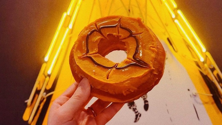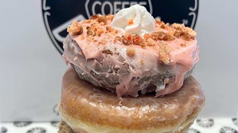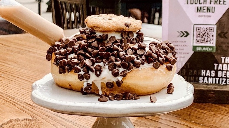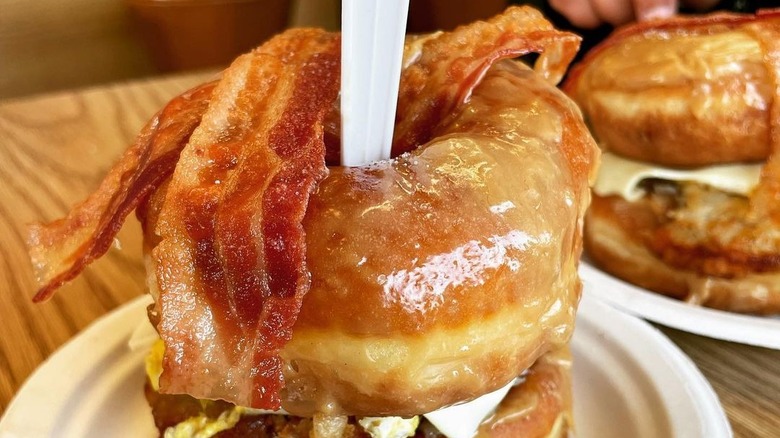 The classic honey dip is the chain's best-seller, but we encourage you to step out of your comfort zone and try something new. As an example, you could try the Nutella-topped Boston cream donut or experiment with the matcha white chocolate. There are even some gluten-free and vegan options. Besides serving donuts au natural, Donut Villa Diner also serves dishes made with donuts. For instance, there's Donut Benny, a riff on Eggs Benedict that comes with a poached egg on top of a donut, finished with hollandaise sauce. Or there's the donut cheeseburger, which is exactly what it sounds like — a cheeseburger served on two donuts instead of a bun.