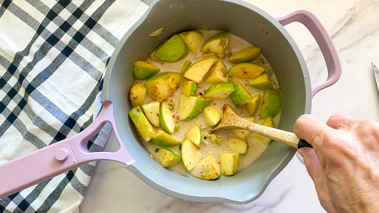 Now add the apples to the pot along with the minced garlic, sugar, and salt. Cook on medium heat for 10 minutes. "The apples will release some liquid and start to soften," Hahn remarks. Then add ⅓ cup water and the coconut milk. Reduce the heat to low and cook for 20 minutes.