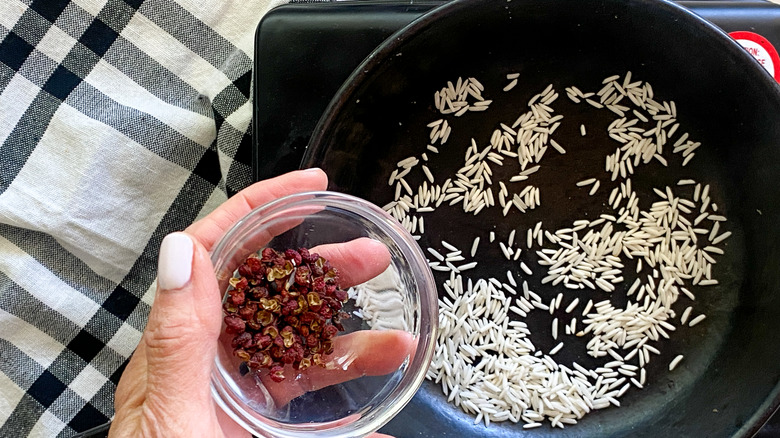 Pull out a small frying pan and heat it to medium. Then add the rice and stir for 3 minutes. "Toasting the rice in this manner will give it a rich and nutty flavor," Hahn mentions. Then add the coriander seeds, cumin seeds, peppercorns, cardamom seeds, cloves, mustard seeds, fennel seeds, and dried chiles. Toast in the pan for about 3 minutes. "The spices will be very fragrant as they toast. Keep a close eye so that they don't burn," Hahn says.