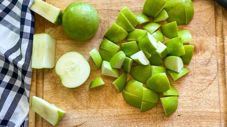 To get the apples ready for the dish, go ahead and chop them into large chunks. You can leave the skin on but discard the cores. "As an alternative to chopping you can also slice the apples if you prefer," Hahn says.