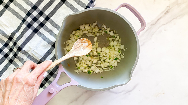 - Add the oil to a medium pot and bring the heat to medium. Drop in the onion and chopped Serrano pepper. Cook and stir for 5 minutes.