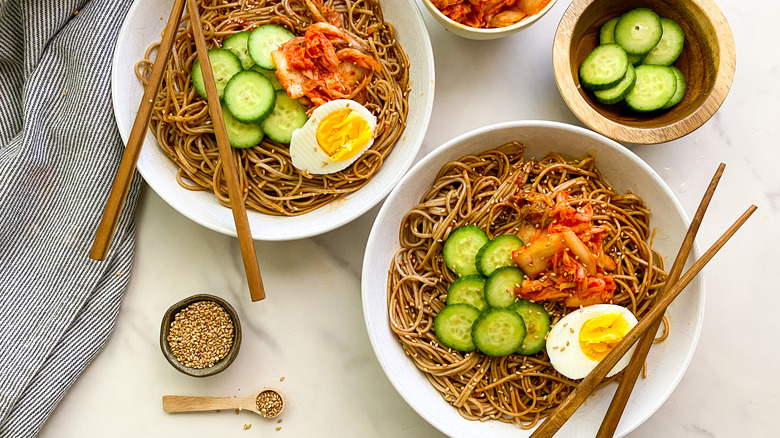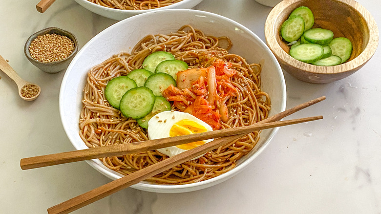 - In a large bowl, combine the cooked noodles and sauce. Top with sliced cucumber, hard-boiled egg, and kimchi. Add more sesame seeds if desired.