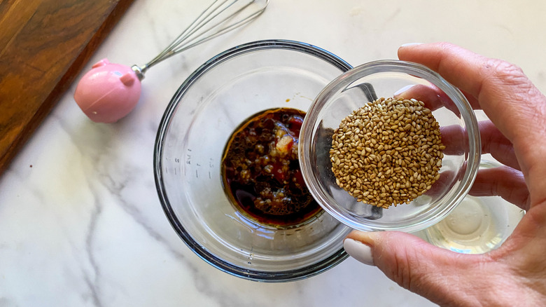 The dressing is a snap to make. Grab a small bowl and add the gochujang sauce, crushed garlic, sesame oil, sesame seeds, honey, soy sauce, and vinegar. Stir to combine. "If you want to make this dressing vegan, you can substitute maple syrup for the honey," Hahn says.