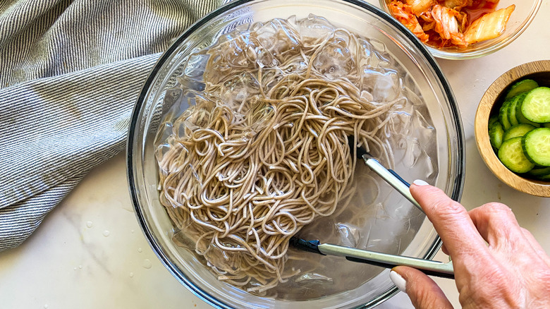 - Cook the noodles according to the package instructions. When they are done, put them into a bowl of ice water to halt the cooking. Let them sit for 5 minutes, then drain.
