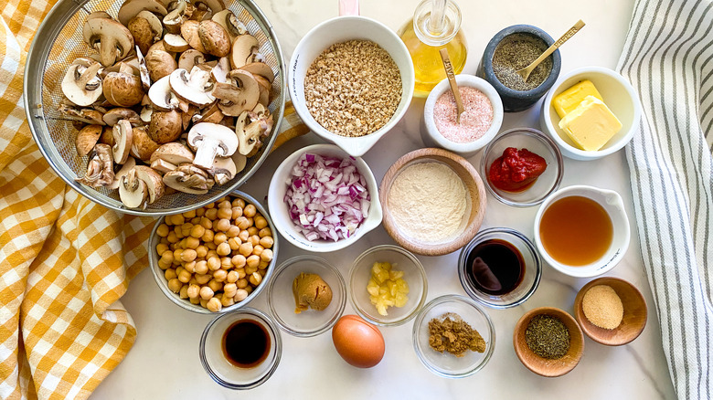 To make this recipe, you'll need lots of pantry staples that you might already have in your kitchen. For the dry goods, you'll need some chickpeas, breadcrumbs, avocado oil, soy sauce, tomato paste, salt, cumin, pepper, flour, vegetable broth, Worcestershire, dried thyme, and garlic powder. "I have also used rolled oats in place of breadcrumbs in this recipe and that works fine if you happen to have those on hand," Hahn shares.