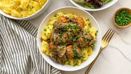 Wellness coach and recipe developer Miriam Hahn brings us this recipe, and she's especially a fan of the clever use of chickpeas to get that desirable meaty texture, without actually using any meat. "Chickpeas are often used to replicate burger and meatball recipes in the vegetarian world and for good reason. They're loaded with plant-based protein, have a meat-like texture when cooked, and when paired with other essentials, they hold together well," she says. "This recipe is delicious on its own or served over steamy hot, buttered mashed potatoes!"