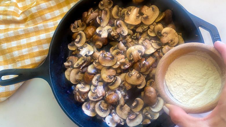 To add some thickness to the gravy, add the flour to the mushrooms and stir to give them a good coating. Then add the broth, remaining soy sauce, miso paste, Worcestershire, thyme, garlic powder, and the remaining salt. Keep stirring until the gravy thickens and all of the ingredients are incorporated before lowering the heat to simmer and setting the timer for 5 minutes.