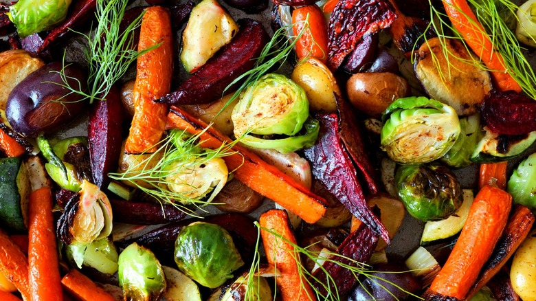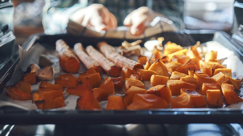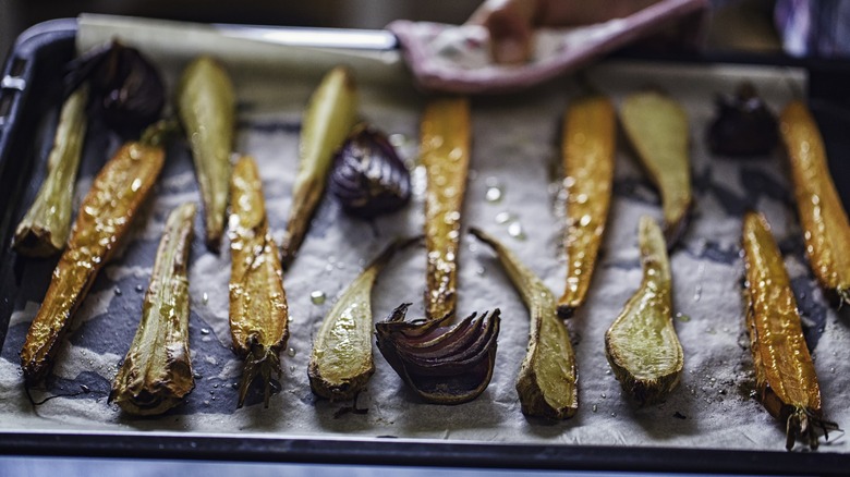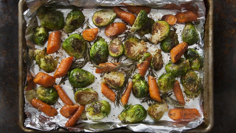 Another helpful tip from the "Barefoot Contessa" host: Keep an eye on those vegetables, and always toss at the halfway mark. Unfortunately, roasting vegetables is never as easy as placing the sheet pan in the oven and waiting for perfection to happen on its own. You must check on the roasting process a few times to make sure the vegetables are cooking evenly and aren't getting too brown on one side. This may seem obvious, but it's easy to get distracted in the kitchen and forget, so it serves as a crucial reminder. Not only will remembering to flip result in a more even roast, it will also help prevent sticking, especially if using a non-stick sheet pan.