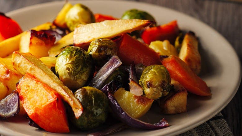 Beyond salt, all that is needed is freshly ground pepper. Simple seasoning will enhance the taste of the veggies and let their natural flavor shine. It also makes the dish more versatile, and you'll be able to pair with a variety of other mains. But of course, if you do want to get a little more adventurous, Garten has roasted vegetable recipes where she peppers in dried or fresh herbs like rosemary or sprigs of thyme. The key, however, is to never overdo the seasoning to the point where it overpowers the flavor of the veggies.