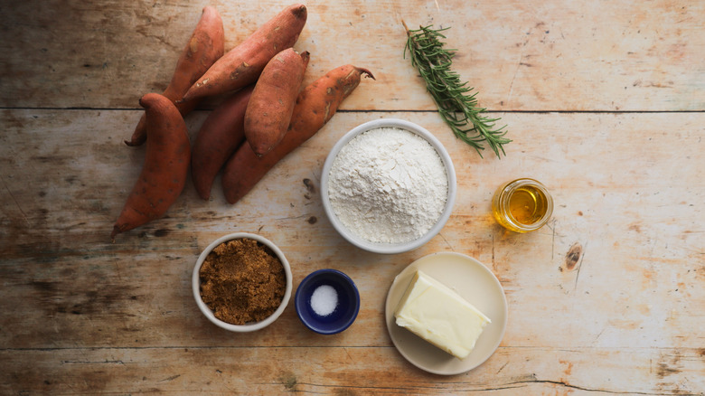 Gather your ingredients for brown butter sweet potatoes with savory rosemary streusel