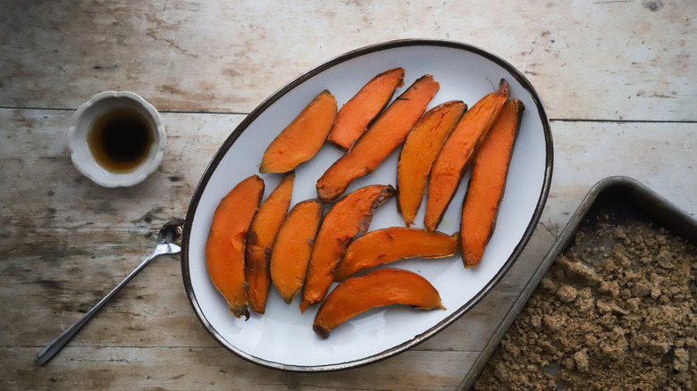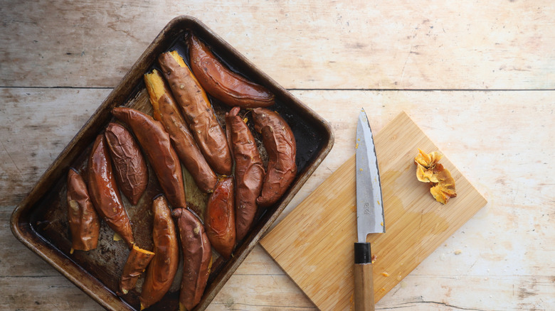 - Place the baking sheet in the oven and bake the sweet potatoes for about 25 minutes, or until they start are softened. Remove and let cool slightly.