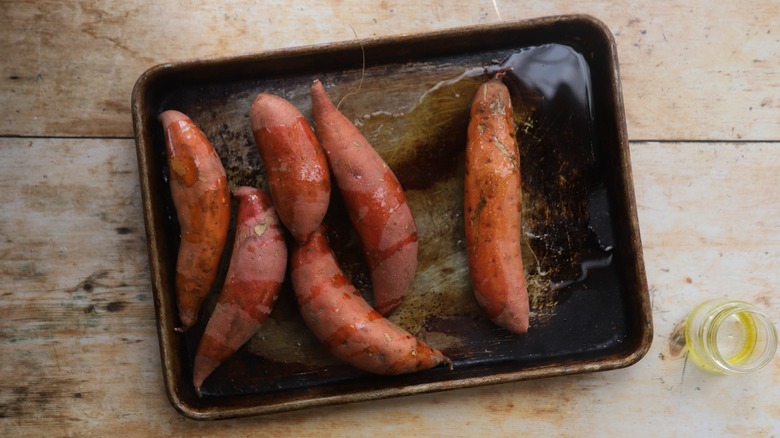 - Preheat your oven to 400 F. Arrange the sweet potatoes on a large baking sheet and drizzle them lightly with olive oil. Make sure each potato is evenly coated.