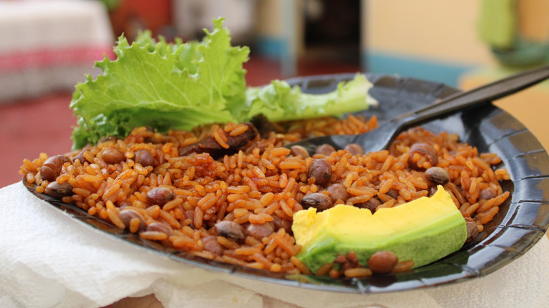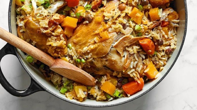 This complex rice pilaf integrates a wide variety of components and flavors, all tied together with rice. A long, white version of the grain — such as jasmine – is employed for the dish. And when it comes to the utilized protein, it's typically beef or chicken, although pelau readily incorporates other meats, too. Coconut milk ties components together, and pigeon peas, a type of lentil, add a textural component. Plus, a scotch bonnet is stirred in for heat. Such components are the typical cornerstone of pelau; further flavors depend on the recipe. Spices range from bay leaf, cinnamon, and star anise to local favorite green seasonings. And sauces span a worldly influence, including Worcestershire, hot sauce, soy sauce and ketchup.