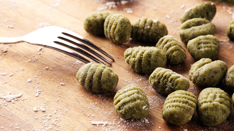 One of the easiest shapes to start with is called cavatelli, meaning "little hollows" because of the dimple that's created, perfect for holding sauce. To create the hollow, a small bit of dough is pushed with a finger or the tip of a table knife, dragging it along the surface so it rolls up. For a fancier cavatelli, you can change up the surface that the dough is pushed on, creating ridges on the outer side along with the dimple. A fork makes great ridges, just place the dough on the back of the fork and pull it down with a finger. A sushi rolling mat, a cheese grater, and even your colander have fun textures to try for cavatelli.