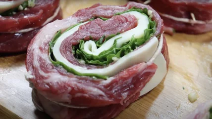 Flank steak works well for this technique since the cut is long and thin, which makes it suitable for rolling with other ingredients. You'll still want to use a mallet to further flatten the flank steak so that it isn't too thick once you add the other items. You should also cut off any extra fat to prevent excess chewiness. Once you roll up the steak with the fillings of your choice, use presoaked bamboo skewers or twine to hold the pinwheels together during cooking.