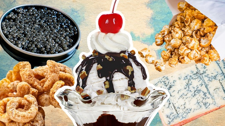Ice cream sundaes just might be the most whimsical of desserts. There's nothing like coming in from the summer heat and treating yourself to a hearty scoop of chocolate or vanilla ice cream loaded up with hot fudge, candied pecans, and a cherry on top. These are ingredients most of us think of when visions of ice cream sundaes dance in our heads, but the beauty of this refreshing dessert is that there are no rules when it comes to toppings. As the digital world grows more deeply connected and more and more people share their favorite takes on classic foods, we've seen plenty of shock value TikToks and Instagram reels showcasing unique toppings for sprucing up ice cream sundaes. There are specialty ice cream shops and brands dedicated to experimenting with unique ice cream flavors. Who are we to say they're wrong?