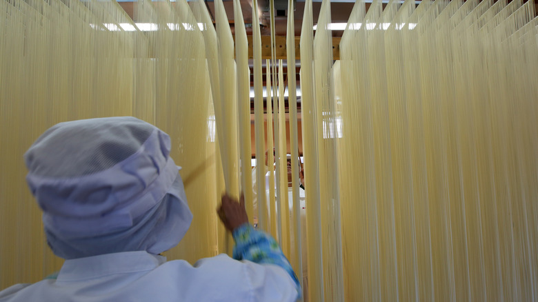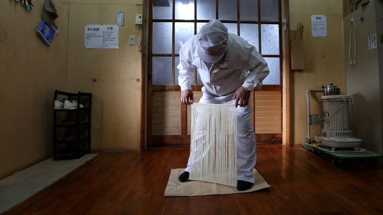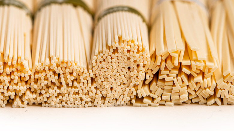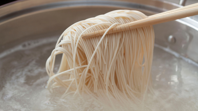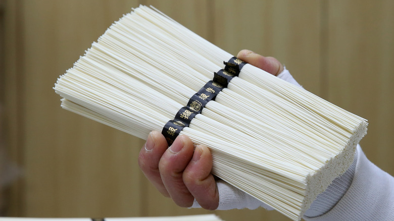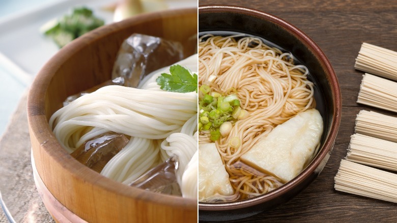 Soba is another popular type of Japanese noodle that is sometimes confused with sōmen. It doesn't help that their names are so similar or that the packaging for both noodles is hard to distinguish. The primary difference between the noodles is the different flour used. Soba noodles are made with buckwheat flour — though many soba noodles use a combination of buckwheat and wheat flour since pure buckwheat noodles can be brittle. Because of the addition of buckwheat flour, soba noodles have more nutritional value, although the difference will depend on how much buckwheat was used. The buckwheat also gives soba noodles a slightly nutty taste, which lends them a more commanding presence.