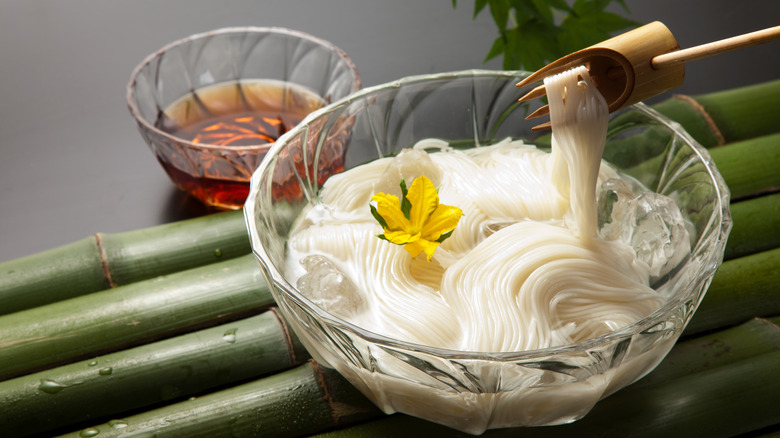 In the winter, thicker noodles are generally preferred, but sōmen is still eaten hot in the form of nyumen. Like many hot Japanese soups, it's a customizable recipe that starts with dashi (an umami-packed broth) and noodles with an open invitation to include whatever vegetables and protein you have on hand. There are also regional variations on sōmen stir fry, like Abura Zomen from the southern Amami Islands, which uses anchovies to give the dish a fresh seafood twist.