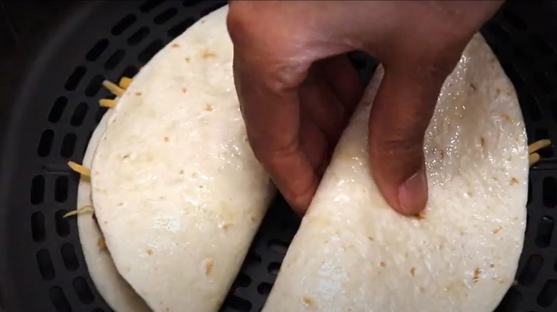 Fold over the tortilla, securing it with a toothpick if needed. Set the air fryer to 350 degrees Fahrenheit for around eight minutes. When it gets to the halfway point, carefully flip the quesadilla, ensuring that it's still tightly sealed. (You will need to take out the toothpicks and reinsert them.) After four more minutes, the quesadilla should be browned and crisped, and your cheese temptingly melted.